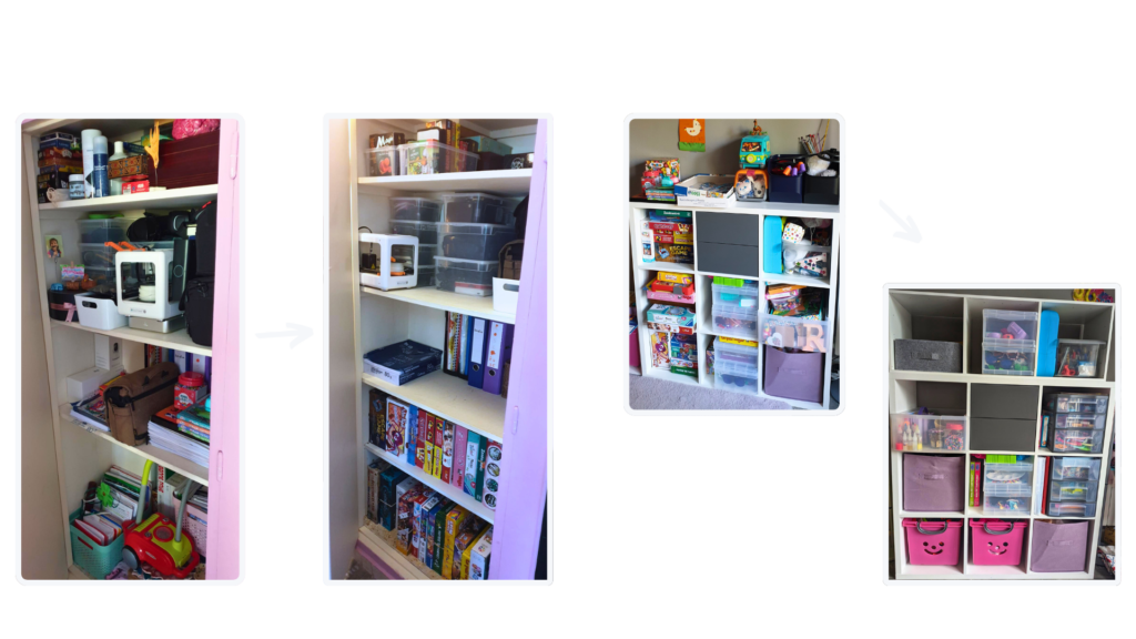 Nous avons fait un gros tri dans les jouets (jeté ceux cassés ou incomplets et donné ceux trop petits) et réorganisé en donnant une fonction à chaque espace (puzzles, activités créatives, Lego, poupées, …). Et tout à portée des enfants pour qu’ils puissent ranger en toute autonomie.