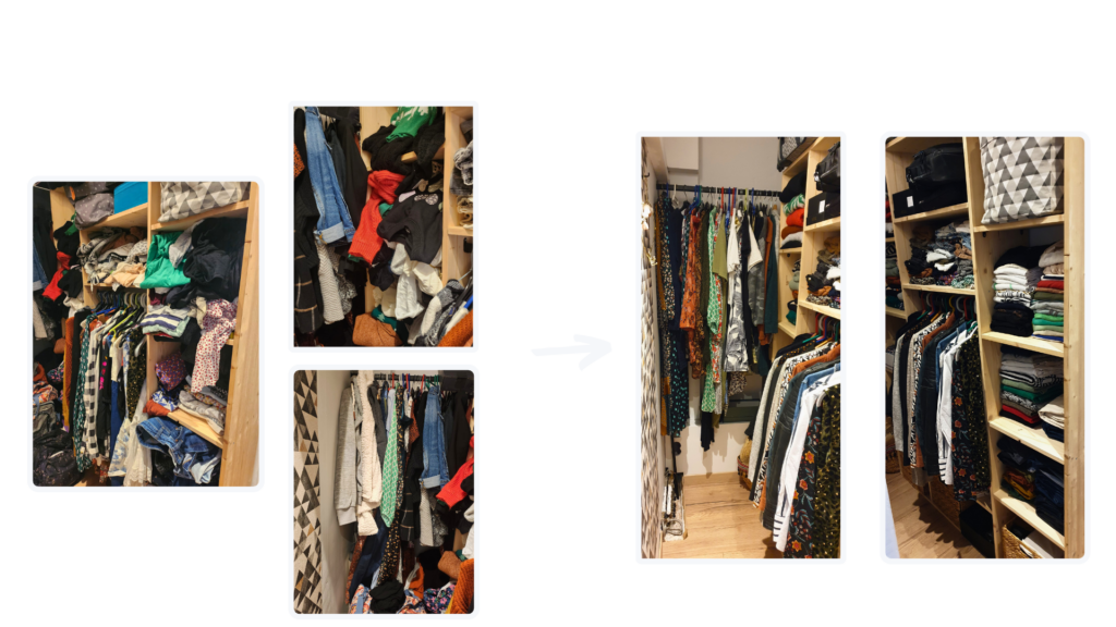 J’ai aidé ma cliente à désencombrer son dressing et à optimiser les espaces pour avoir accès à tout facilement. Lors de la phase de tri, elle a également pris conscience de la quantité de vêtements qu’elle possédait et qu’elle n’avait pas besoin d’en avoir autant pour bien s’habiller au quotidien.