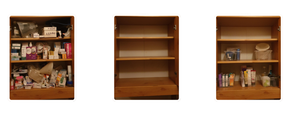 C’est un espace de la maison que l’on ne pense pas à trier et vider régulièrement et qui peut donc se remplir très rapidement… Entre les médicaments périmés que l’on avait gardés au cas où et ceux entamés mais non finis, ma cliente a pris conscience de tout ce qu’elle avait accumulé inutilement. Au final, ne garder que les traitements en cours et quelques médicaments de premiers secours est largement suffisant.